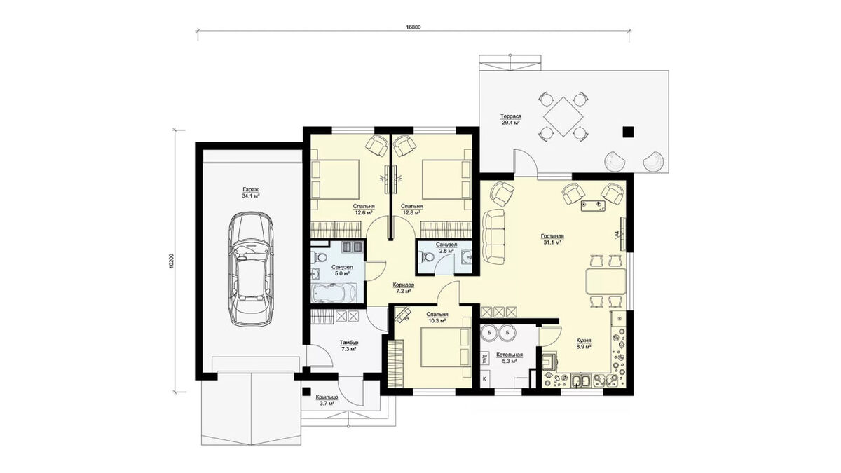 🏡 Представляем проект МС-162/2 — современный одноэтажный коттедж с 3 спальнями, гаражом и просторной террасой! 🌿 Этот загородный дом из ЖБИ панелей продолжает серию МС-162 и идеально подойдет для комфортного круглогодичного проживания семьи из 4-5 человек. ✨ Основные особенности проекта: ✔️ Уютная планировка с тамбуром (7,3 м²) и коридором (7,2 м²) ✔️ Три светлых спальни (от 10,3 до 12,8 м²) ✔️ Просторная гостиная (31,1 м²) с объединением с кухней (8,9 м²) — выход на большую террасу (29,4 м²) 🌞 ✔️ Два санузла для удобства всей семьи ✔️ Гараж на 34,1 м² и котельная, отвечающая современным стандартам отопления 🔥 ✔️ Высота потолков — 3,05 метра, что создает ощущение простор и уюта 🔄 В проекте есть возможность объединения двух спален в одну большую комнату — без дополнительных затрат! Если ищете похожий дом, но без гаража, обратите внимание на проект МС-162/1. 🔗 Хотите узнать больше? Подробнее о проекте → https://benpan.ru/project/ms-1622-odnoehtazhnyj-dom-s-garazhom/?utm_source=dze