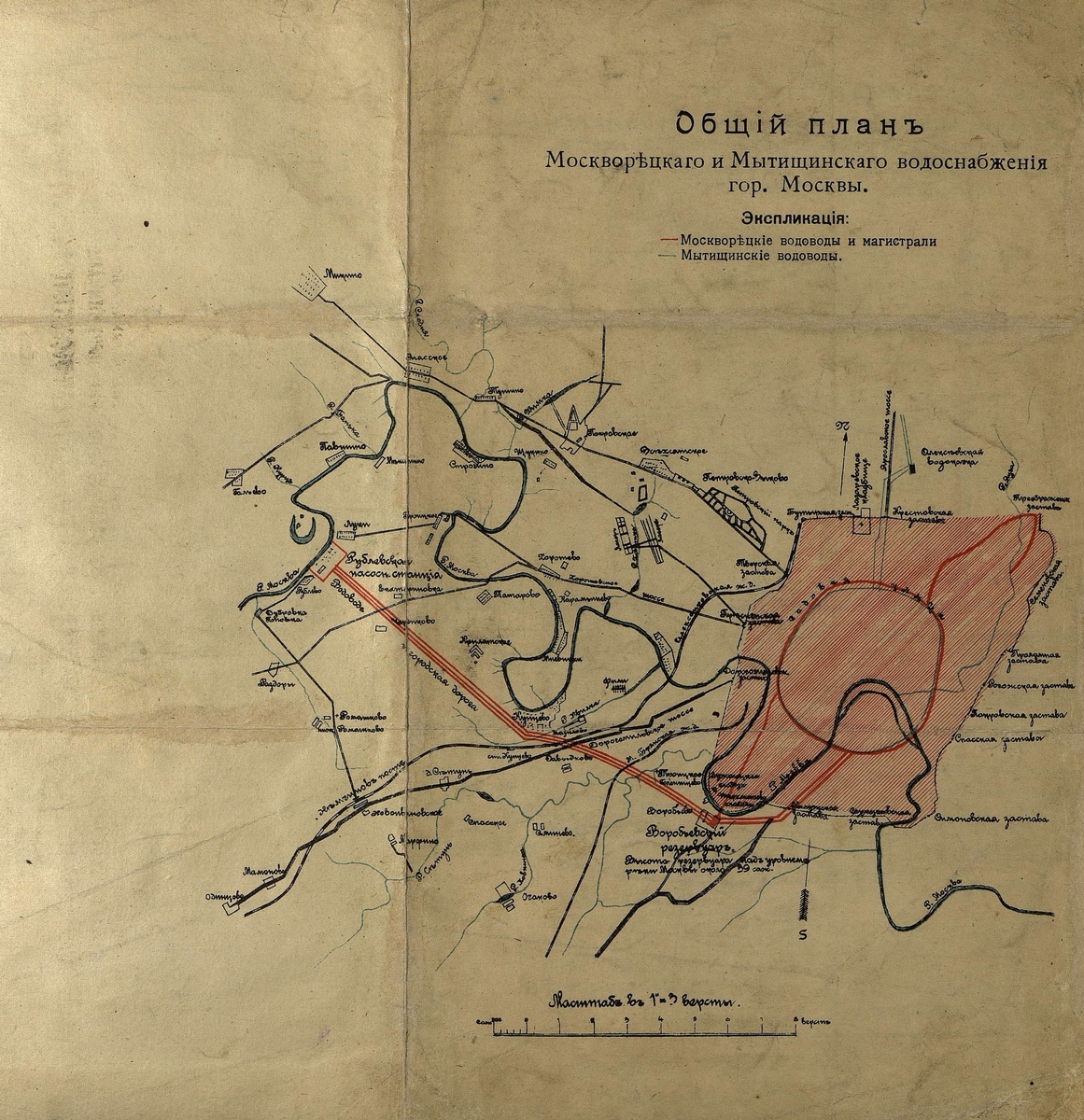 День добрый! Я рад поделиться с Вами двумя старыми красивыми красивыми чертежами Москворецкого водопровода опубликованными после 1913 года, когда он заработал в полную силу. Система состояла из трёх элементов: Рублевской водозаборной станции, трёх водоводов, подававших воду в тогда ещё просто крупный региональный промышленный и купеческий город и Воробьевских резервуаров для регулирования давления, располагавшихся в одной из наивысших точек близ Москвы. На плане внизу хорошо видны все части системы. Схему работы Рублевской станции Я специально вытащил из PDF отчета МГУ в самом лучшем качестве, которое можно найти. Забор воды шел из реки в насосную первого подъема с поршневыми насосами, оттуда по напорным трубопроводам в отстойники, от них самотеком на предварительную фильтрацию, затем на медленные фильтры (английские фильтры), после чего в резервуар чистой воды и только после этого насосная второго подъема с центробежными насосами перекачивала воду на Воробьевы горы по трем водоводам с