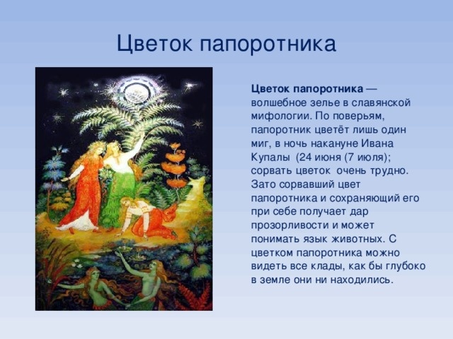 Папоротник - растение не только полезное и красивое, но и таинственное, овеянное многими легендами и сказаниями. По преданию в ночь на Купалу распускается на несколько мгновений волшебный огненный цветок папоротника.