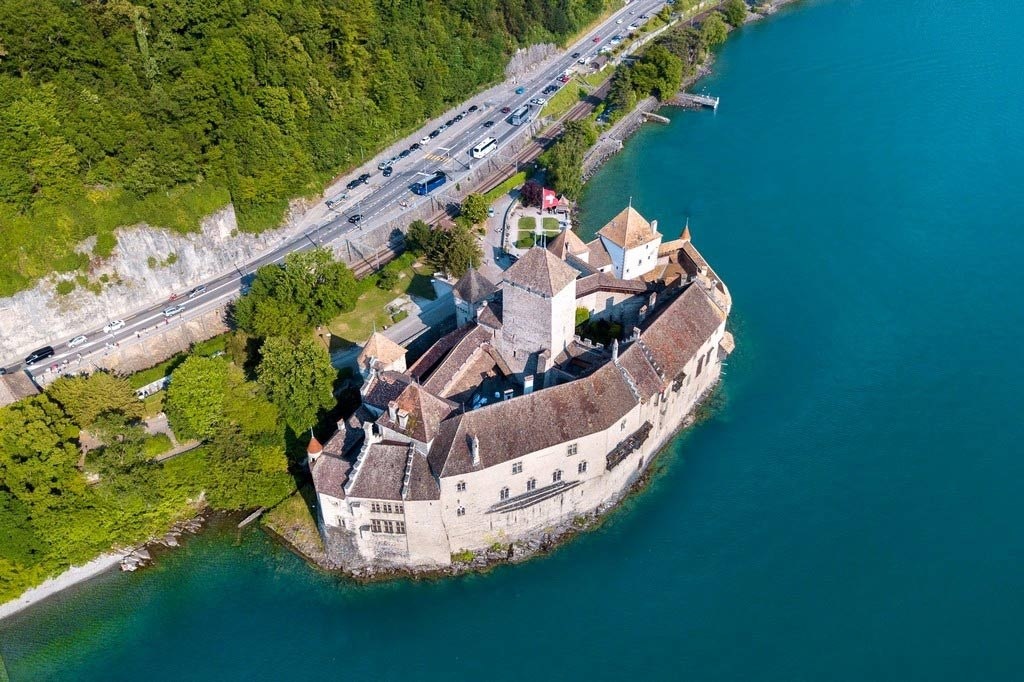 Шильонский замок 13 века на берегу Женевского озера в Швейцарии (хотя некоторые исследования доказывают, что замок уже существовал в 9