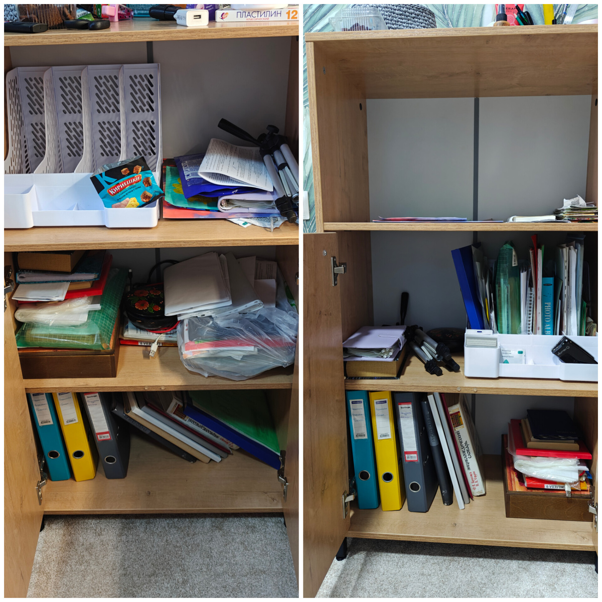 • Навела не большой порядок в шкафу. Именно не большой, потому что это всё ещё нужно расхламлять, каждую бумажку пересматривать, раскладывать по местам. То, что попадалось не нужное, я конечно выкидывала и набралось не мало.