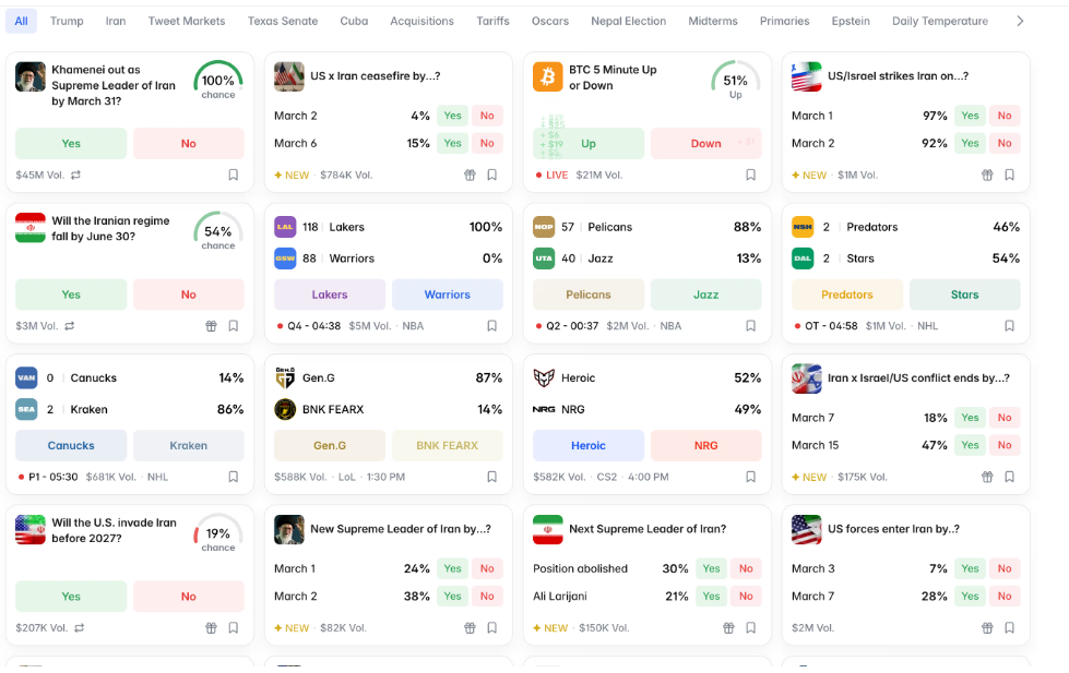 Скорость и специфичность рынков поразительны. Игроки делают ставки не только на эскалацию конфликта, но и на то, как закончится конфликт, кто сменит иранского аятоллу Али Хаменеи и войдут ли американские сухопутные войска в Иран к 07.03.