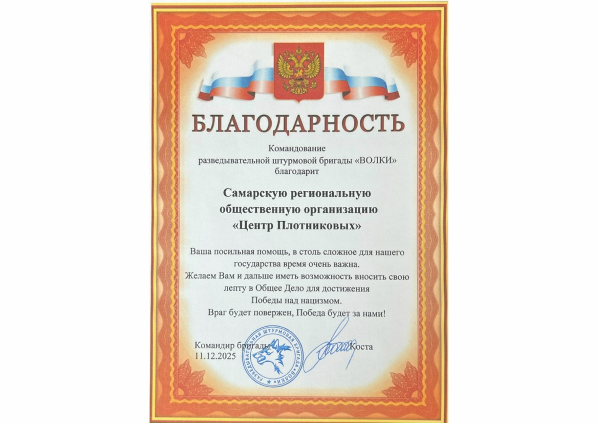 «Ваша посильная помощь в столь сложное для нашего государства время очень важна. Желаем Вам и дальше иметь возможность вносить свою лепту в общее дело для достижения Победы над нацизмом. Враг будет повержен, Победа будет за нами!» Благодарственные письма такого содержания от командования легендарной разведывательной штурмовой бригады «ВОЛКИ» поступили в адрес «Центра Плотниковых» и лично руководителя нашей организации Сергея Плотникова, а также на имя наших партнеров по гуманитарной акции «Всё для Победы!». С первого дня специальной военной операции «Центром Плотниковых» на постоянной основе организован сбор материальных ресурсов для поддержки наших ребят, выполняющих боевые задачи по защите Родины на фронтах СВО. Акция «Всё для Победы!» нашла широкий отклик: нас поддержали общественные и коммерческие структуры, органы власти и административные организации, а также десятки неравнодушных жителей региона. Среди тех, кого особо отметили бойцы бригады «ВОЛКИ» — президент Корпорации «РосРег