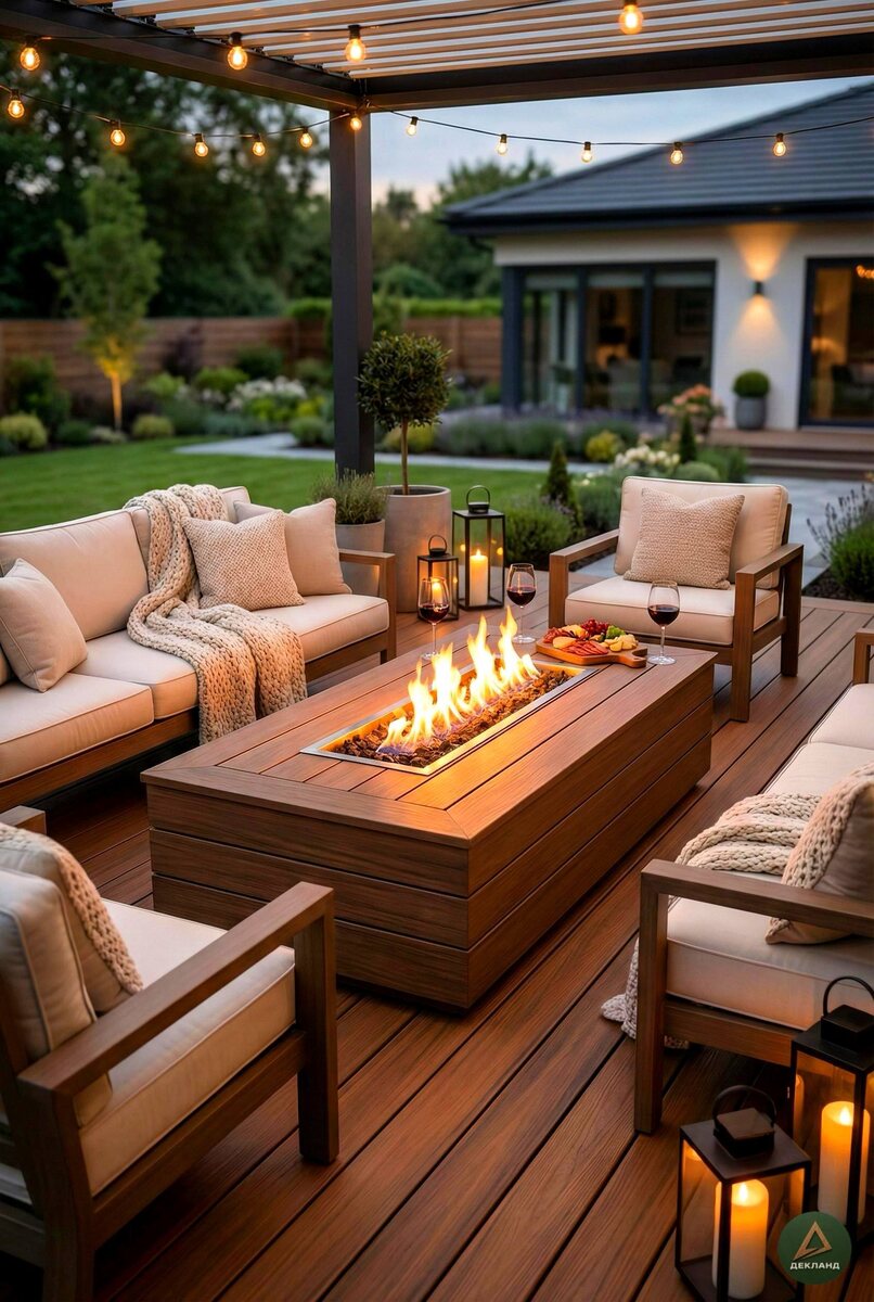Мечта любого загородного жителя: прохладный вечер, бокал вина или чашечка кофе, пледы и потрескивающий огонь прямо на террасе. Это то самое место притяжения, где гости задерживаются до утра. Но как совместить деревянный пол и открытое пламя? Обычно это страх за искры, перегрев и испорченные доски. Именно поэтому костровые зоны на основе МПК и ДПК сейчас — абсолютный тренд в ландшафтном дизайне. Взгляните на фото 👆 — это не просто "дорого-богато" визуально, это инженерно грамотное решение. Почему композит (МПК/ДПК) — лучший выбор для зоны очага? ✅ Пожаробезопасность. Качественный композит не поддерживает активное горение так, как это делает сухая натуральная древесина. ✅ Стойкость к жару. Материал спокойно выдерживает тепловое излучение от современных чаш (важно: используйте модели на ножках или специальном постаменте, чтобы не было прямого контакта с настилом). ✅ Никаких следов. Случайно упавший уголек не прожжет дыру насквозь. Это тот случай, когда эстетика и безопасность работа
