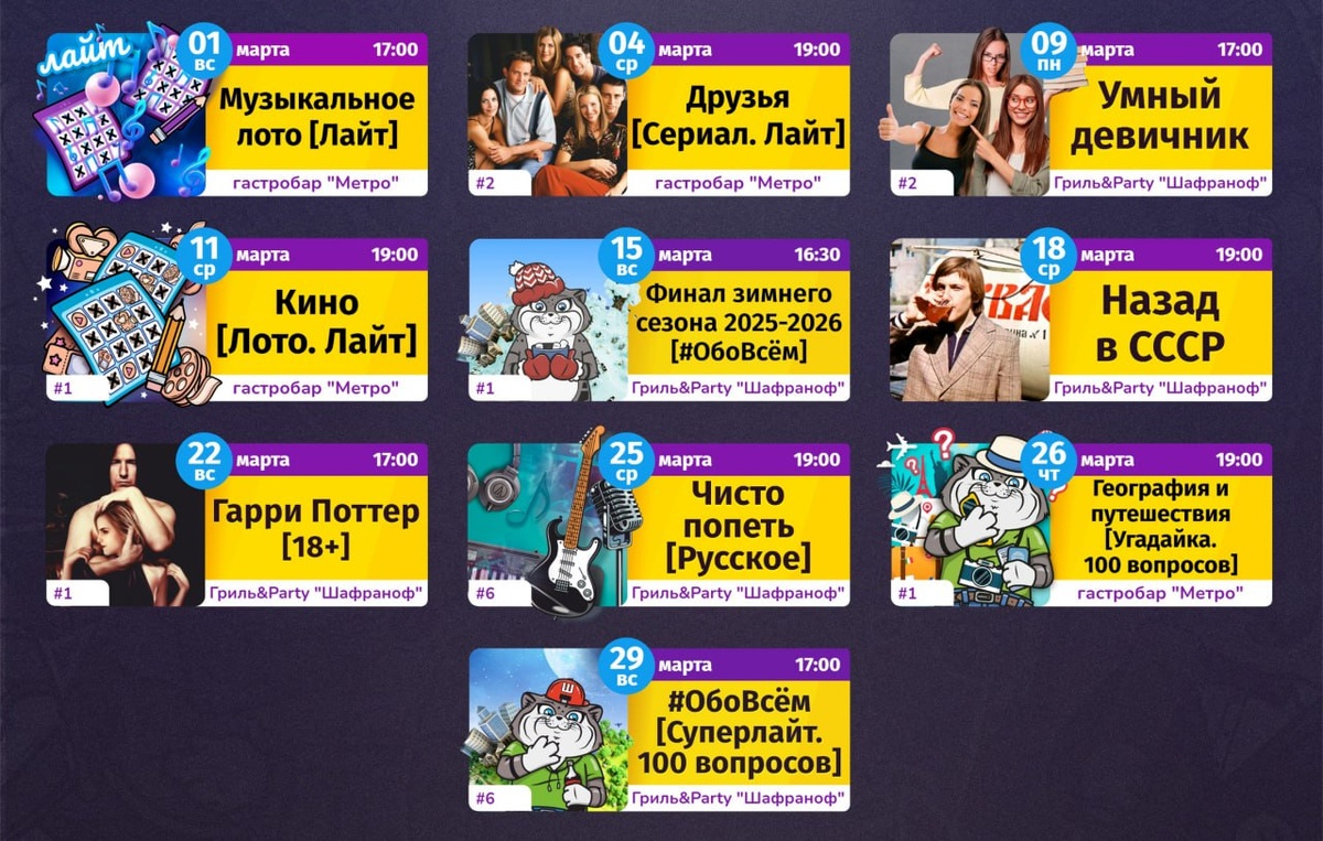 🕐4 марта,19:00 – Сериал "Друзья" 🕐9 марта, 17:00 –Умный девичник 🕐11 марта, 19:00 – Лото "Кино лайт" 🕐15 марта, 16:30 – Финал зимнего сезона 🕐18 марта, 19:00 – Назад в СССР 🕐22 марта, 17:00 – Гарри Поттер 18+ 🕐25 марта, 19:00 – Чисто попеть – русское 🕐26 марта, 19:00 – Угадайка "География и путешествия" 🕐29 марта, 17:00 – Суперлайт "Обо всем" 🪙500 рублей 📍Гриль&Party "Шафраноф", ул. Ленина, 77а 📍гастробар "Метро", ул. Полины Осипенко, 9 🔑регистрация здесь Предложить публикацию:@zabkulisye_bot Забкулисье в MAX