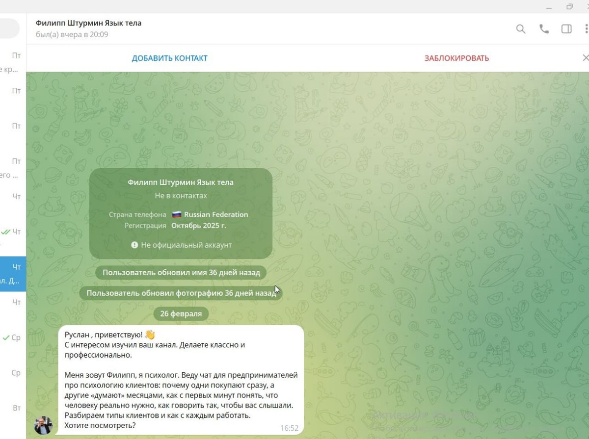 Самое сильное раздражение когда пишут несколько раз, типа отправили предложение, а потому через некоторое время спрашивают реакцию, актуально или нет? Я обычно таких без раздумий баню, даже если актуально. Потому что если меня интересует предложение — то добавляю в отдельный заготовленный чат и могу написать в ответку , но такое происходит крайне редко. Потому что нереально со всеми интересными предложениями вступать в диалог и тратить на это время, будет время, напишу. По этому обращаюсь тем кто регулярно пишет в личку, не нудите постоянными вопросами после основанного обращения! К тому же я редко кого блочю если просто один раз написали и все. Я все отлично понимаю, времена тяжелные, так же партизанским маркетингом иногда пользуюсь, но когда один и тот же бот или пользователь долбит в личку, то это редфлаг и кнопка заблочить. У кого тысячи подписчиков сколько раз в день вас бомбардируют? Если у меня блин столько в день обращений🫣