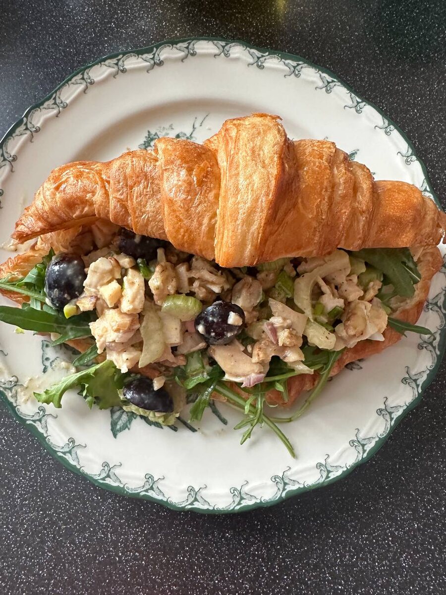 4. Разрезать круассаны вдоль не до конца, раскрыть и положить по два листа салата. Между ними выложить салат с курицей и сразу подавать.