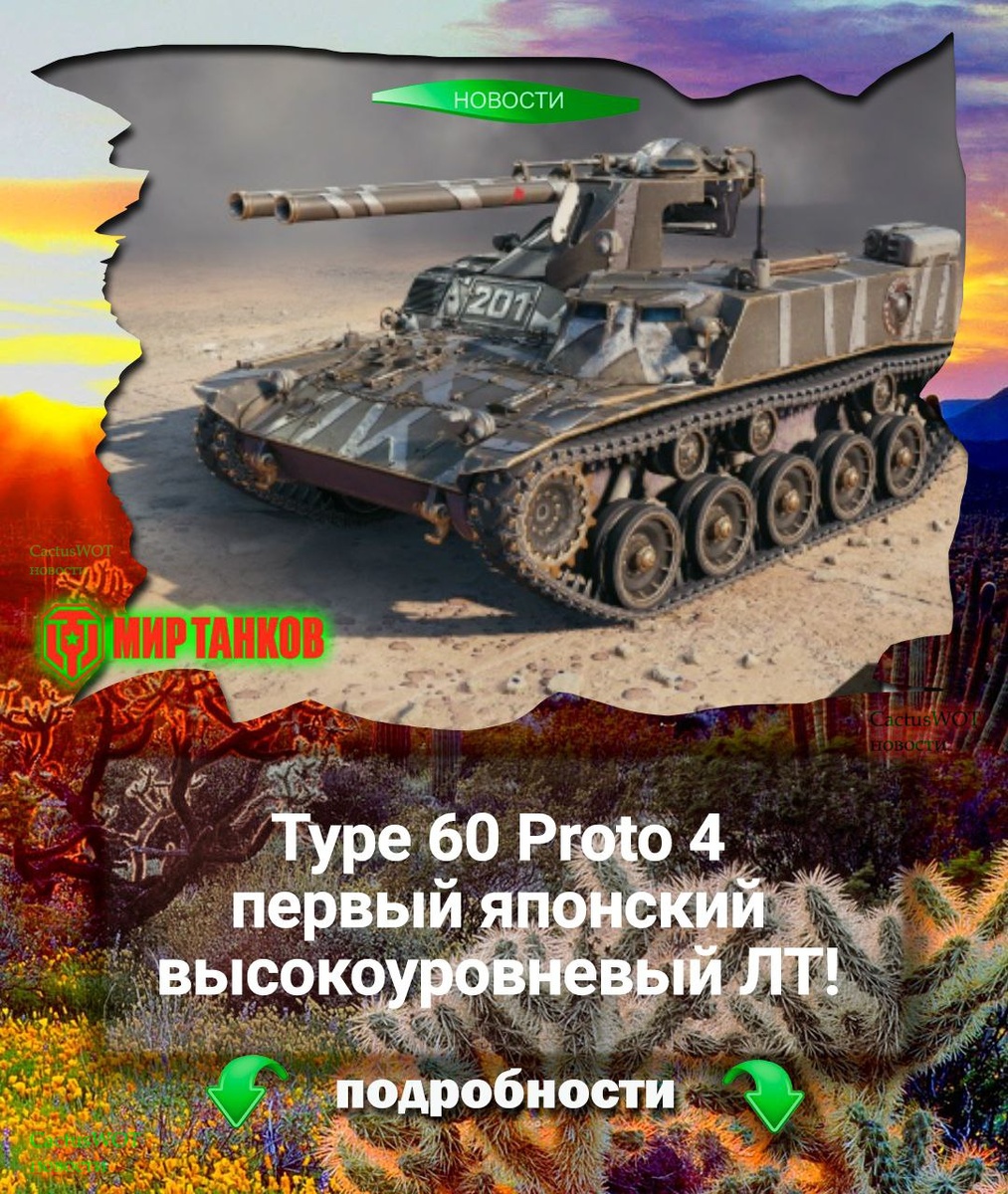 !🇯🇵 Всем привет! Посмотрим на первую японскую ЛТ. Type 60 Proto 4. ЛТ-8, прем. Механика двухствольных орудий. 📊ТТХ (не финальные и могут измениться): Средний урон: 300/400/400 ед. Бронепробиваемость: 220/130/50 мм Перезарядка: 28,76/4/2 (сек/между/количество) Перезарядка одного орудия: 14,38/14,38 сек Время залпа: 3/2 сек Время сведения: 1,7 с Разброс на 100 м: 0,48 УВН: -15/20° Углы поворота башни: 45/30° Средний урон в минуту: ~1250 Прочность: 1000 Бронирование корпуса: 30/10/10 мм Бронирование башни: 10/15/10 мм Макс. скорость: : 65/25 км/ч Удельная мощность: 29,55 л.с/т. Обзор: 390 м Дальность связи: 750 м Незаметность: 20,73/4,56% Скорость полета снарядов: КС - 800, HESH-фугас - 600, ОФ - 600 🗞ПЕРВЫЕ ВПЕЧАТЛЕНИЯ: Танк возможно будет пользоваться спросом. Любители ЛТ возможно возьмут его в оборот. • По маскировке японец не дотягивает до Ёлки, но её всё равно будет хватать для комфортного света. • HESH-фугасы! Давать по всяким борщам и скорпам по ~800 урона — будет очень вкус