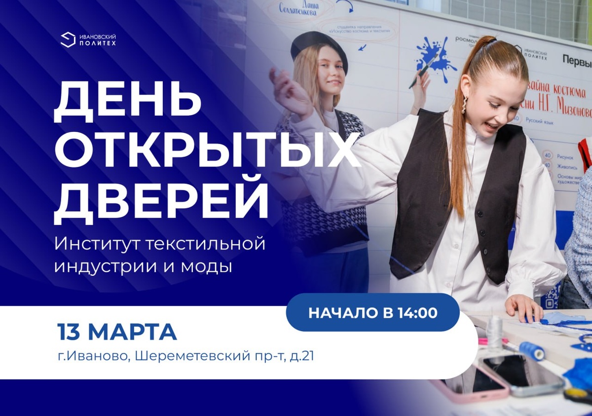 🗓 13 марта, 14:00 📍 г. Иваново, Шереметевский проспект, 21 Ивановский Политех приглашает учащихся школ, лицеев, гимназий, студентов колледжей, а также родителей будущих абитуриентов на День открытых дверей Института текстильной индустрии и моды. Вас ожидают презентации самых востребованных направлений подготовки, в том числе с двойными квалификациями: 🔹 Дизайн и продвижение цифрового продукта 🔹 Технологии изделий индустрии моды 🔹 Инжиниринг и управление в текстильном производстве 🔹 Промышленный дизайн одежды 🔹 Экспертиза и товарный менеджмент в цифровой экономике 🔹 Дизайн костюма 🔹 Дизайн текстиля 🔹 Радиоэлектронные и телекоммуникационные системы 🔹 Системы автоматизации технологических процессов и производств 🔹 Технологии и экспертиза функциональных материалов Студенческая жизнь ближе, чем кажется. Приглашаем погрузиться в ее атмосферу! Приходите познакомиться и пообщаться с преподавателями и студентами, а также попробовать свои силы в интерактивных зонах. 👉 Обязатель