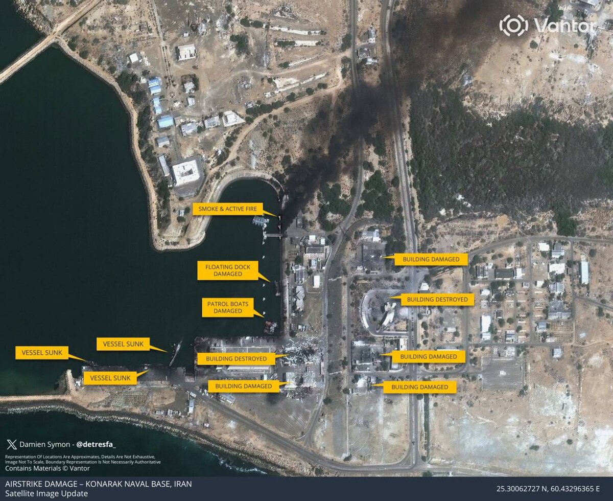 Спутниковые снимки показывают три затонувших судна и серьезные повреждения на военно-морской базе Ирана в Конараке.