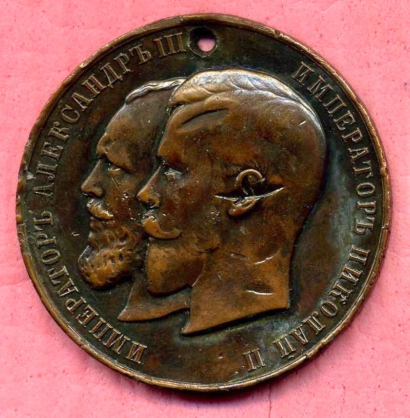 Аверс: барельефные портреты Александра III и Николая II, обращённые влево. По окружности - надпись: «ИМПЕРАТОРЪ АЛЕКСАНДР III ИМПЕРАТОРЪ НИКОЛАЙ II».