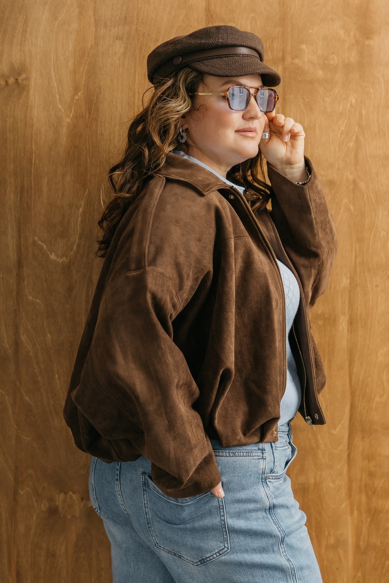 Бомбер формирует аккуратную линию плеча — это сразу делает фигуру более собранной. Мягкая экозамша добавляет глубину и благородство.