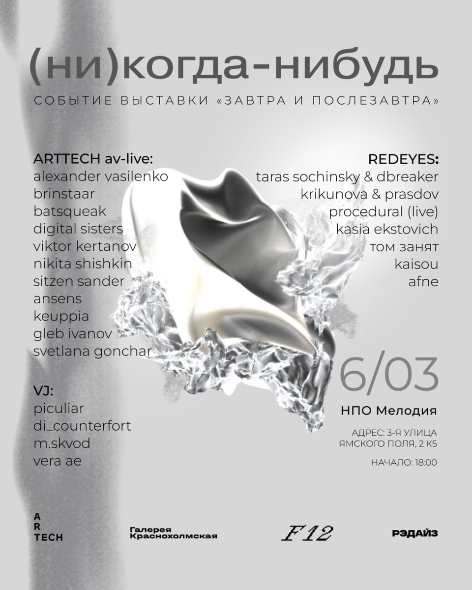 #dub #electronic #experimental ► (ни)когда-нибудь ● TG ● VK Постцифровой дримкор в формате AV-live и DJ-сетов, рассуждение о туманном прекрасном будущем, ускользающей мечте, хранящей в себе всё лучшее из прошлого. Участники: ► svetlana gonchar ● TG ► ansens ► digital sisters ● TG ► nikita shishkin ● TG ► keuppia ● TG ► viktor kertanov ► gleb ivanov ► alexander vasilenko ● TG ► brinstaar ● TG ► batsqueak ● TG ► sitzen sander ► taras sochinsky & dbreaker ► krikunova & prasdov ► procedural ► kasia ekstovich ► том занят ► kaisou ► afne Билеты от 1000₽