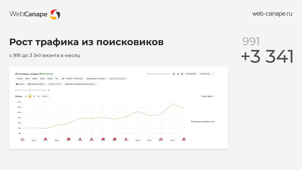 В сентябре 2023 года к нам обратилась компания-поставщик поршневых и винтовых компрессоров. Летом силами других подрядчиков сайт неудачно «переехал» на Битрикс, и бизнес столкнулся с резким падением трафика и потерей позиций в поисковиках. Ситуация нередкая и у нас есть практический опыт ее исправления. Запрос клиента: По результатам предварительного аудита мы составили план работы и приступили к его реализации. Собрали семантику и проработали структуру сайта. Провели базовую SEO-оптимизацию — настроили файлы robots.txt и sitemap.xml, проверили на наличие «битых» ссылок и дублей страниц, зарегистрировали сайт в вебмастерах, настроили редиректы, заполнили метатеги и т.д. Далее регулярно работали над расширением структуры сайта, наполнением его контентом, доработкой карточек товаров. Составили стратегию ссылочного продвижения, которая особенно важна для продвижения в Google. В результате за год работы над проектом трафик из поисковиков вырос более чем в 3 раза — с 991 до 3 341 визита в м