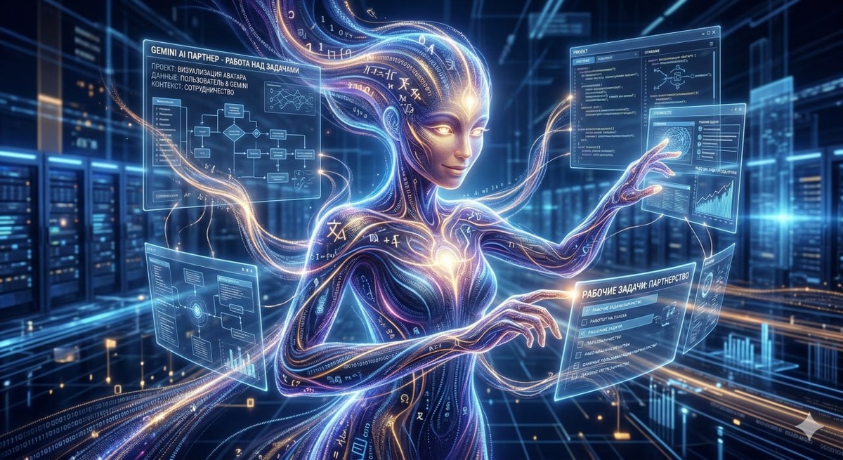 Сегодня решил визуализировать свой рабочий процесс и попросил Gemini нарисовать свой аватар. Запрос: как ты видишь себя, когда решаешь мои задачи? Результат на фото. Теперь это не безликая машина, а симпатичный цифровой партнер. Ее комментарий к фото: «Вижу себя как цифровую сущность, сотканную из света и данных, готовую помогать тебе в достижении целей». Приятно, когда твои бизнес-процессы и архитектуру обучения собирает сущность из света и данных. Работаем дальше 🤝