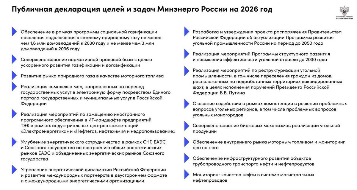 Опубликована публичная декларация целей и задач Минэнерго РФ на 2026 год. Документ задаёт вектор развития ТЭК на ближайшие годы — и для производителей кабельно-проводниковой продукции это важный сигнал. Ключевые направления: 🔹 Масштабная газификация и догазификация План — подключение не менее 1,6 млн домовладений к 2030 году и 3 млн к 2036 году. Это означает активное строительство распределительных сетей и энергоинфраструктуры — спрос на силовой, контрольный и монтажный кабель будет расти. 🔹 Развитие инфраструктуры трубопроводного транспорта нефти и нефтепродуктов Модернизация и строительство объектов требуют надежных кабельных решений для насосных станций, КИПиА, систем автоматизации и диспетчеризации. 🔹 Реструктуризация и развитие угольной отрасли До 2030 года — повышение эффективности и модернизация предприятий. Это инвестиции в энергоснабжение, безопасность и автоматизацию шахт и перерабатывающих мощностей. 🔹 Цифровизация ТЭК и развитие отечественного ПО Развитие ИТ-ландшафта и