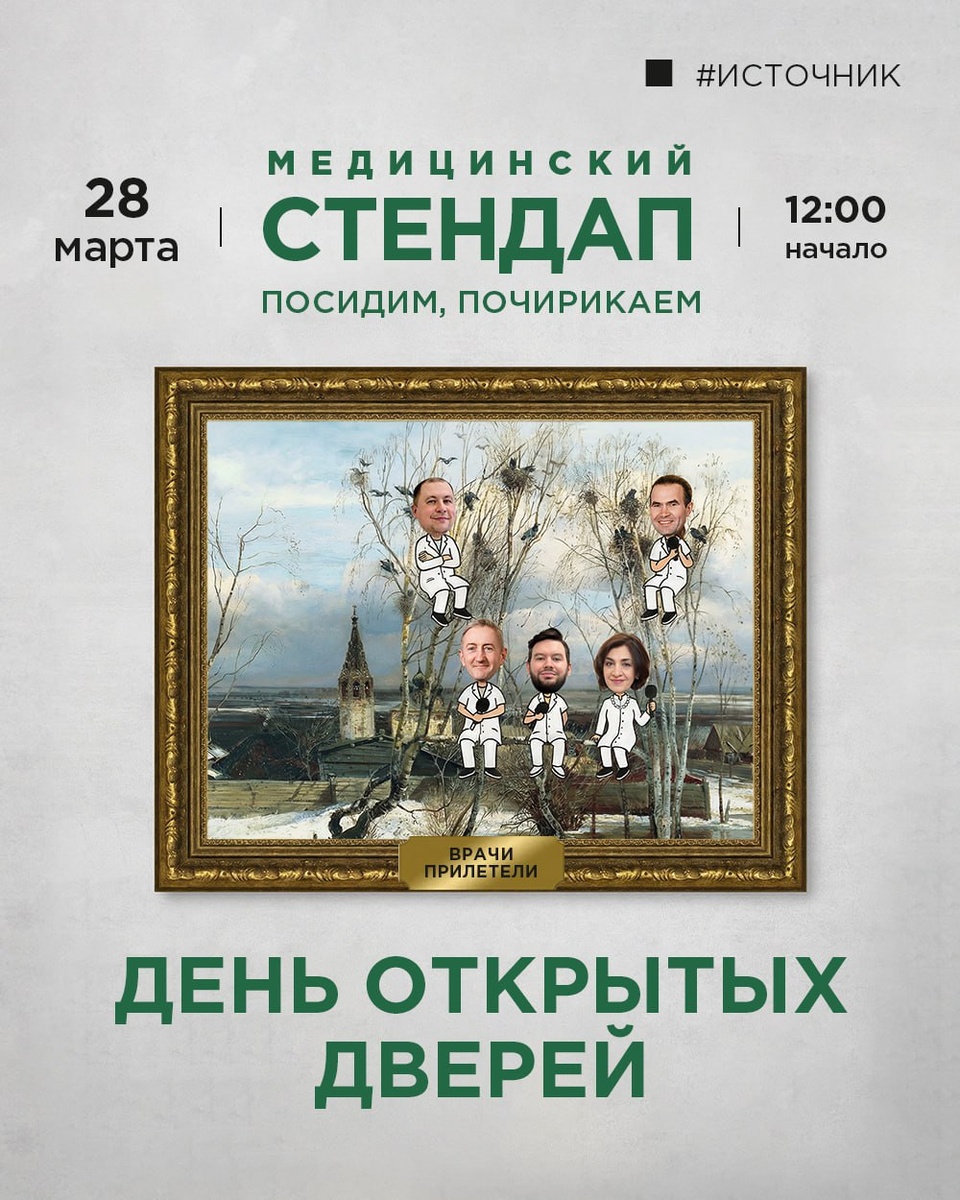!🌱 Поговорим о серьезных медицинских темах с юмором? 🎤Мы вновь проведем для вас медицинский стендап. Будет откровенная и позитивная встреча с нашими врачами. Никакого страха «белого халата», никаких сложных объяснений. Все просто, легко и понятно! ВАС ЖДУТ: 🌀искренние и остроумные сеты от тех, кто каждый день бережет ваше здоровье; 🌀ароматный кофе от нашего постоянного партнера; 🌀возможность получить личную экспресс-консультацию от врачей клиники; 🌀сюрпризы, о которых мы расскажем чуть позже! 👩⚕️👨⚕️ВРАЧИ, КОТОРЫЕ БУДУТ С ВАМИ: - Сергей Никитин - заведующий отделением ВРТ, акушер-гинеколог, репродуктолог, к.м.н. - Анжела Егунян - акушер-гинеколог, кандидат медицинских наук - Игорь Решетников - эмбриолог, кандидат биологических наук - Илия Довжанский - уролог-андролог - Максим Иванов - анестезиолог-реаниматолог Подарите себе необычный день, полный открытий, легкого юмора и полезных знаний! ❗️Встреча бесплатна, но нужна предварительная запись по ссылке: istochnik-spb.tim
