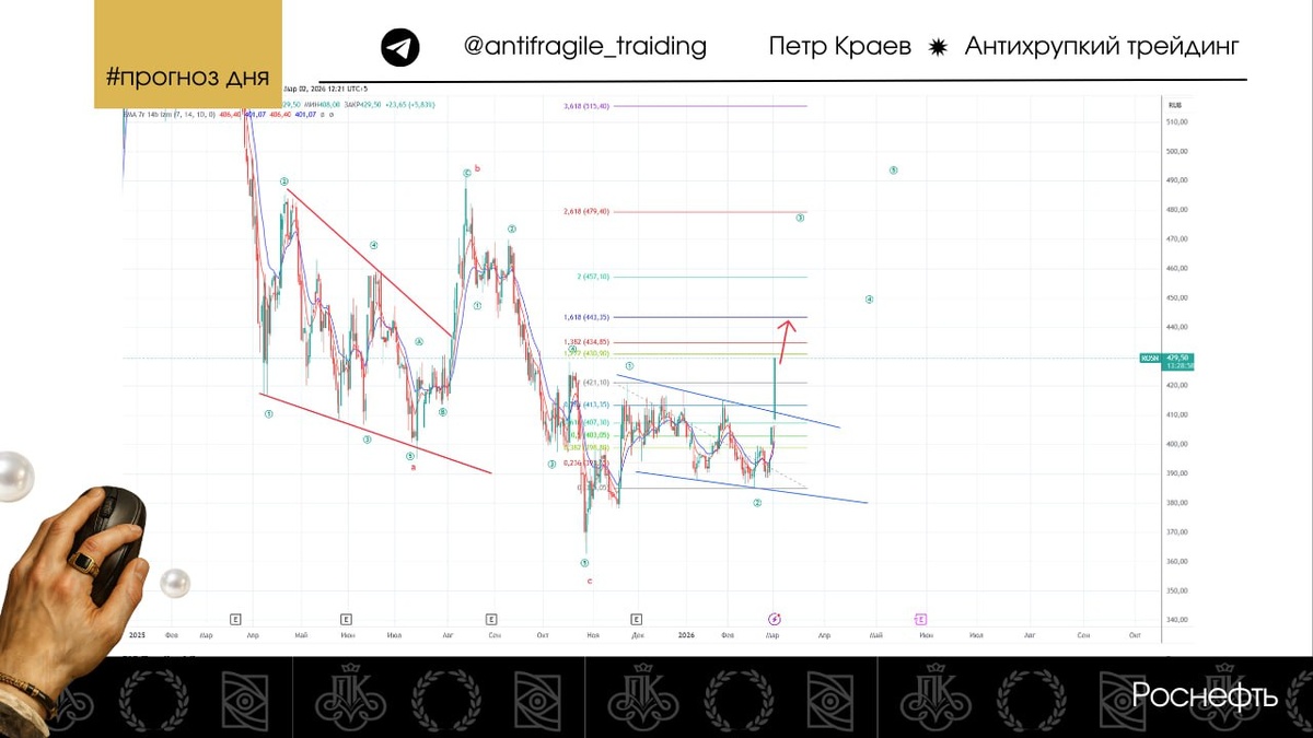 Тут все по плану. С момента прошлого поста треугольник на рост "перерисовался" в клин, но на прогноз и вероятности роста это не влияет никак. Локальная цель движения 443,35. Далее будем посмотреть. Есть шанс на долгосрочный разворот и я очень хочу верить, что все движение перерастет в устойчивый восходящий тренд. 👁️🗨️Ссылка на график: https://www.tradingview.com/x/TIUYHYG4/ В Клубе свои позиции в Роснефти мы нарастили еще по 401,05. Сейчас просто удерживаем. Данное сообщение носит информационный характер и не является индивидуальной инвестиционной рекомендацией.