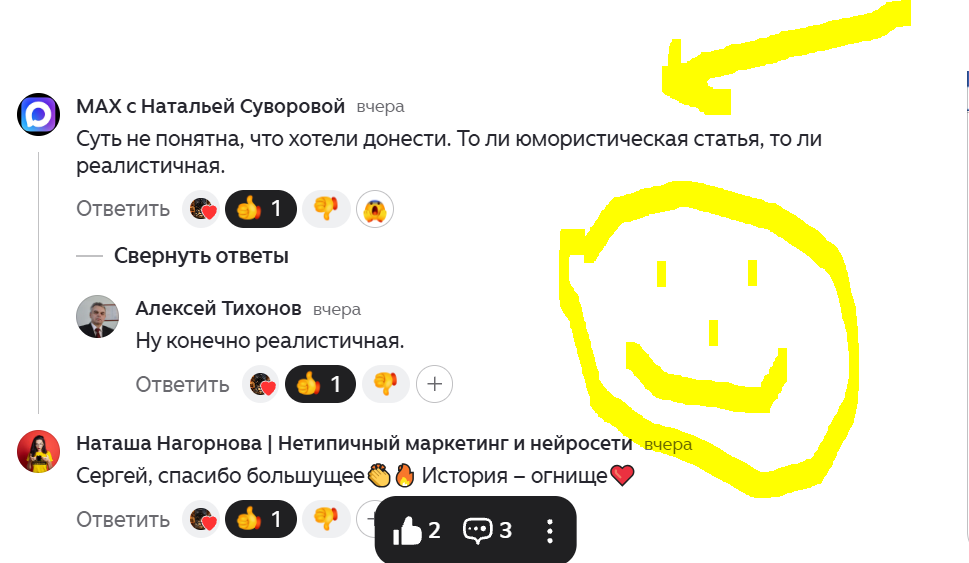 В комментариях появилась Наталья Суворова из MAX (или, как теперь говорят в народе, «из того самого MAX»). Ее вердикт был краток и суров: «Суть не понятна, что хотели донести. То ли юмористическая статья, то ли реалистичная».