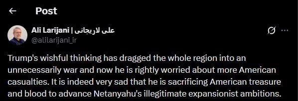 ․ Թրամփի առավելապաշտ մտածողությունը ամբողջ տարածաշրջանը ներքաշել է անհարկի պատերազմի մեջ, և այժմ նա իրավամբ մտահոգված է ամերիկյան նոր զոհերով։ Իսկապես ցավալի է, որ նա զոհաբերում է ամերիկյան ռեսուրսներն ու կյանքերը՝ առաջ մղելու Նեթանյահուի ոչ օրինական առավելապաշտական հավակնությունները։