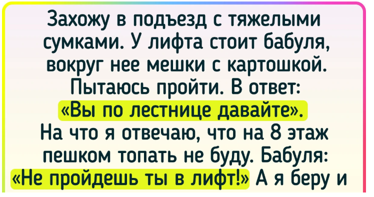 - Захожу в подъезд с тяжелыми сумками. У лифта бабушка с мешками картошки. Я здороваюсь и пытаюсь пройти, а она говорит: «Идите по лестнице, мы тут картошку домой везем». Я отвечаю, что мне с сумками на восьмой этаж пешком тяжело. В ответ слышу: «В лифт не попадешь!» Тогда я поднялась на второй этаж, вызвала кабину и напомнила, что лифт общий. Столько нелестных слов в свой адрес я давно не слышала.
