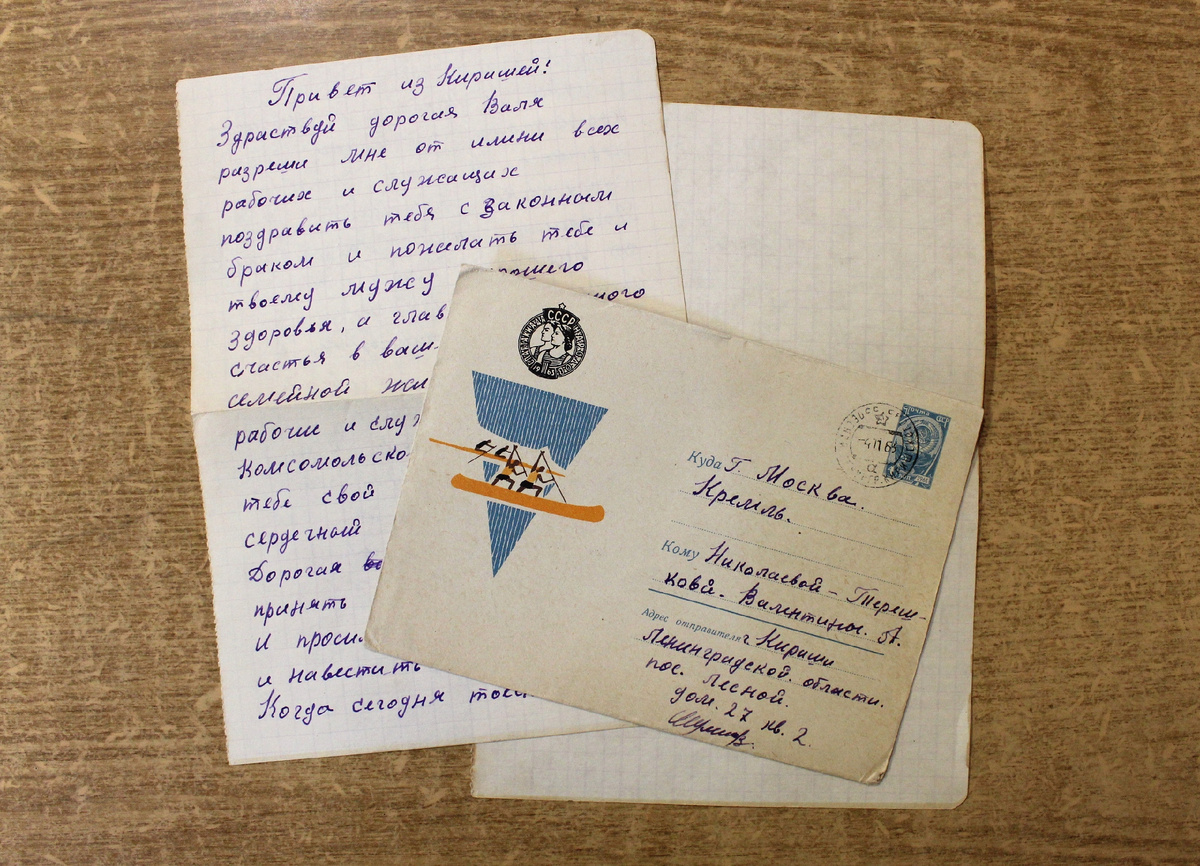 В День написания бумажных писем хотим познакомить с новым предметом эпистолярного жанра, пополнившим нашу музейную коллекцию в этом году. На конверте указан адрес: г. Москва, Кремль. Письмо от киришанина Шумилова, проживавшего в пос.Лесной, дом 27, кв. 2. Написано оно 3 ноября 1963 года и адресовано Валентине Николаевой-Терешковой. Конечно, в 60-х годах ХХ века космонавты были всеобщими любимцами. Их портреты размещались рядом с фотографиями родных и близких. Поэтому неудивительно, что письмо подписано «ваш Шумилов».