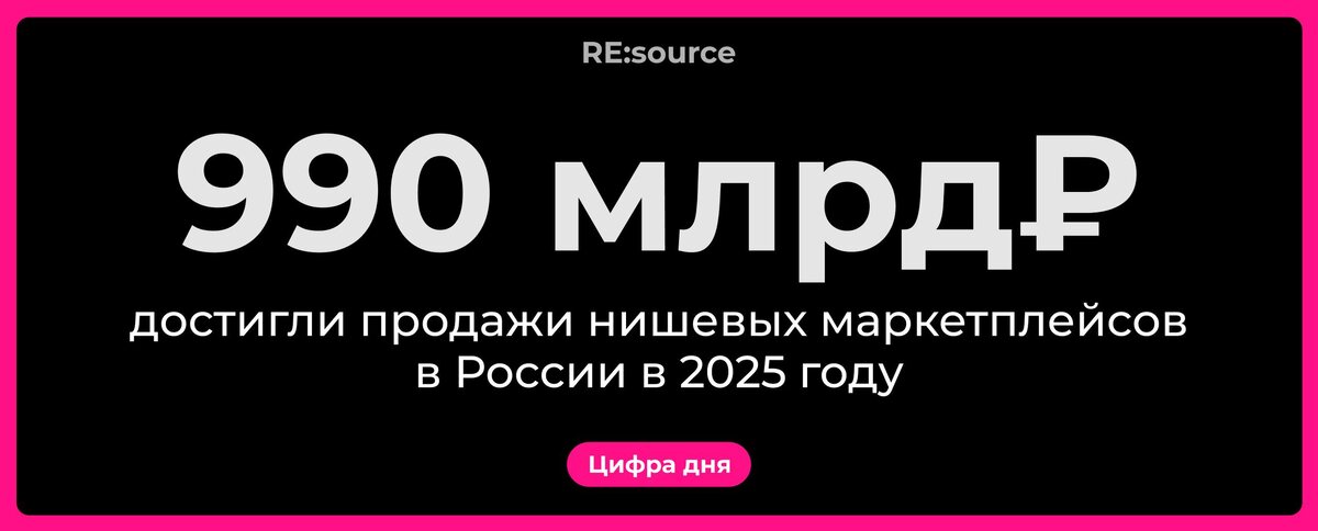 🔹🔹🔹 Объем продаж нишевых маркетплейсов составил 990 млрд рублей в 2025 году За прошлый год продажи российских нишевых маркетплейсов выросли на 22%. Несмотря на дальнейшее замедление роста, по оценкам экспертов, в 2026 году объем рынка может достигнуть 1,1 трлн рублей. Источник: Т-Бизнес, Data Insight (рус) #цифрадня Подписаться на RE:source