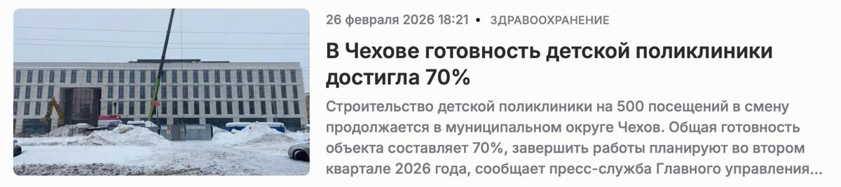 Готовность детской поликлиники на улице Мира в Чехове составляет 70%, а окончание строительства намечено на второй квартал года. Об этом сообщили в пресс-службе Главного управления государственного строительного надзора Московской области после проведения проверки. При этом в конце января в министерстве строительного комплекса региона называли совсем другие цифры и даты. Так, 28 января в ведомстве сообщили о том, что объект будет достроен до апреля, а его готовность превысила 87%. По какой причине данные официальных ведомств расходятся, не поясняется. Фото: Главгосстройнадзор МО