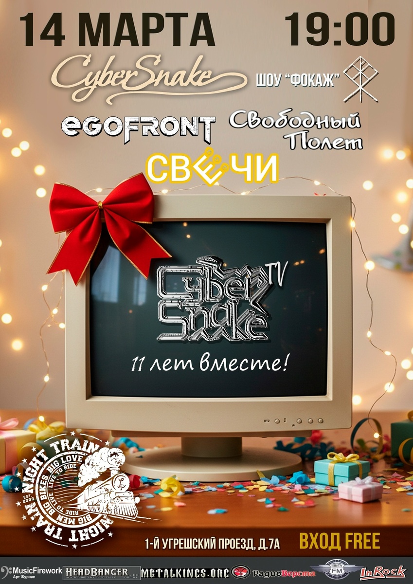 14 марта в клубе Night Train состоится выступление Cyber Snake, EGOFRONT, Свободный полет, СВЕЧИ, шоу Фокаж. Начало в 19.00. Вход свободный. Адрес: г. Москва, 1-й Угрешский пр., 9А, м. Угрешская. 16+