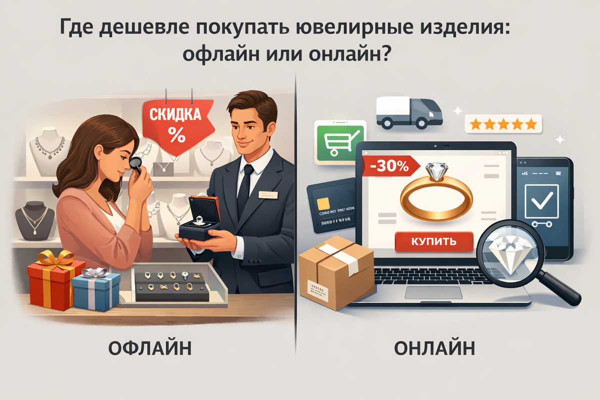 торг/бонусы на комплект (кольцо + серьги).Иногда офлайн выигрывает именно финальной ценой, а не «процентом скидки». - Можно сразу оценить изделие. Ювелирка — это про посадку, блеск, закрепку, оттенок металла, «как сидит камень». В офлайне вы: