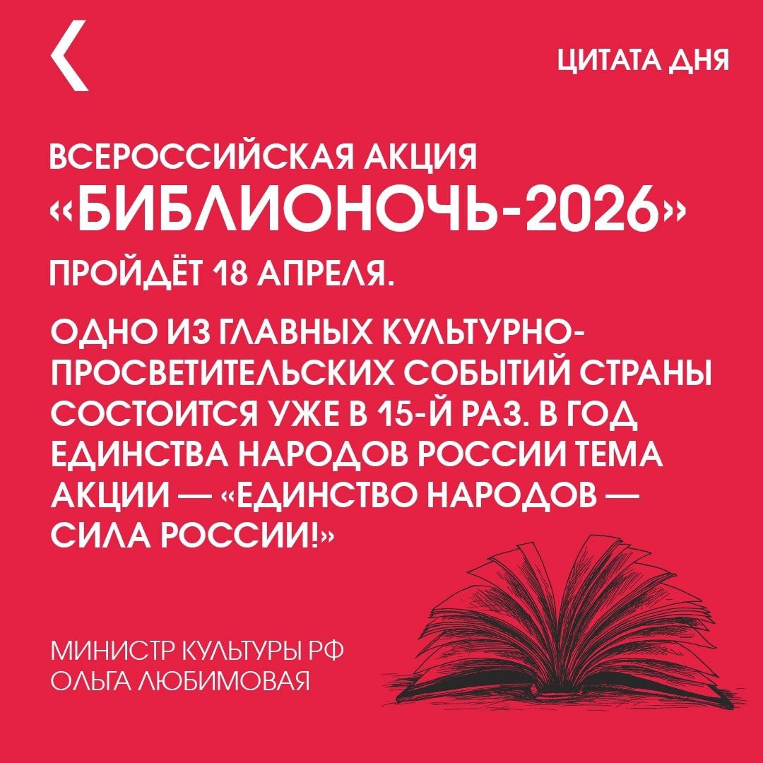 ! По всей стране состоятся книжные выставки и ярмарки, поэтические чтения, тематические экскурсии, встречи с авторами, лекции, мастер-классы, концерты и театрализованные представления. «В Год единства народов России тема акции — «Единство народов — сила России!». Координатором выступит Российская государственная библиотека», — сообщила министр культуры РФ Ольга Любимова. В 2025 году акция охватила 19 тысяч библиотек по всей России, и в ней приняли участие 1,5 млн человек, из них более 700 тысяч — дети. В Донбассе и Новороссии события акции посетили свыше 7 тысяч человек. Подробная афиша событий будет опубликована на порталах «Культура.РФ» и «Культура24». #КрайВысокойКультуры #культураКрасноярья