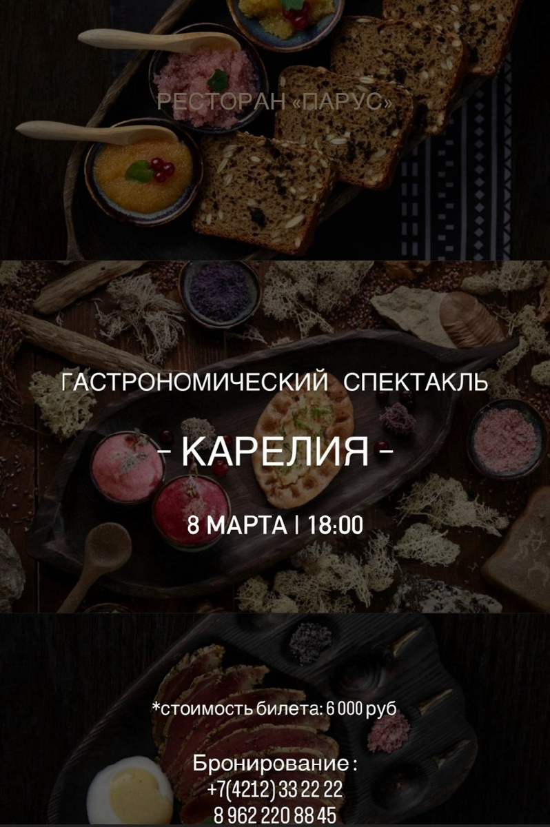 » ✔ Уникальный гастрономический спектакль от Ивана Балина — бренд-шефа музея-ресторана «В Карелии Есть» ✔ Путешествие в Карелию через вкусы локальных продуктов и атмосферные истории края ✔ Авторский гастроужин с фужером игристого ✔ Вечер вкуса, уюта и настоящего праздничного настроения ✔ Количество мест ограничено 📅 Когда: #8_марта, 18:00 ⛳ Где: ресторан «Парус», ул. Шевченко, 5 💳 Стоимость: 6000 руб. 📞 Контакты: +7 (962) 220-88-45 👉 Афиша Хабаровска. Куда сходить, экскурсии