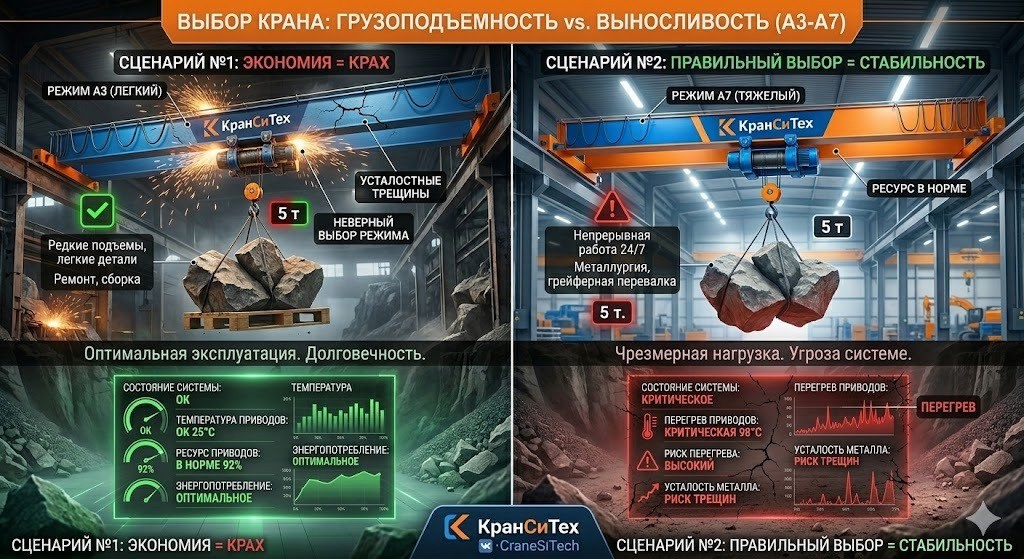 ? Представьте тяжелоатлета: поднять штангу весом 50 кг один раз за тренировку — задача вполне обычная. Но что, если заставить его поднимать этот же вес каждые три минуты без остановок на протяжении суток? Вес снаряда не изменился, но нагрузка на организм возрастает колоссально. С промышленными кранами работает тот же принцип. Поднять 5 тонн один раз за смену или тягать этот вес непрерывно в режиме 24/7 — это принципиально разные задачи. Именно за выносливость оборудования отвечает режим работы (классы от А3 до А7). ⚖️ Разбираем классы: от легкого к тяжелому А3 (Легкий): Кран для точечных задач. Большую часть времени отдыхает, работает в основном с легкими деталями, а номинальный груз поднимает редко. Где нужен: ремонтные зоны, сборочные участки, небольшие склады. А5 (Средний): Универсальный боец. Золотой стандарт для работы в 1–2 смены с регулярными нагрузками разной массы. Где нужен: металлообработка, классические механические цеха. А7 (Тяжелый/Весьма тяжелый): Стальной марафоне