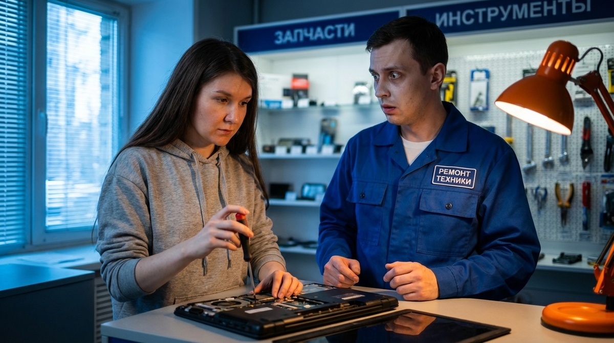 На стойке приема лежал мой рабочий ноутбук, а по ту сторону стеклянной витрины возвышался типичный «гуру ремонта». На его бейджике гордо значилось: «Антон. Старший специалист».