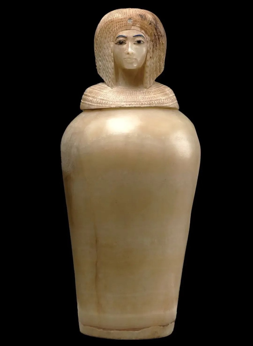 1349–1330 гг. до н. э.) Перед нами — изящный канопический сосуд, вырезанный из тонкого кальцита. Крышка выполнена в виде спокойного лица царственной женщины: вытянутые черты, миндалевидные глаза и мягкие линии рта — характерные признаки позднего амарнского стиля. Сосуд входил в группу из четырёх каноп, найденных в гробнице KV55. Исследователи нередко связывают его с царицей Кия, одной из супруг фараона Эхнатон, хотя прямых надписей, подтверждающих это, не обнаружено. Этот артефакт остаётся одной из загадок амарнского периода — эпохи религиозных реформ и художественного переосмысления образа царской власти. #ДревнийЕгипет #Амарна #Археология #История #яснимаюкаир #египет #музеиегипта #историяегипта