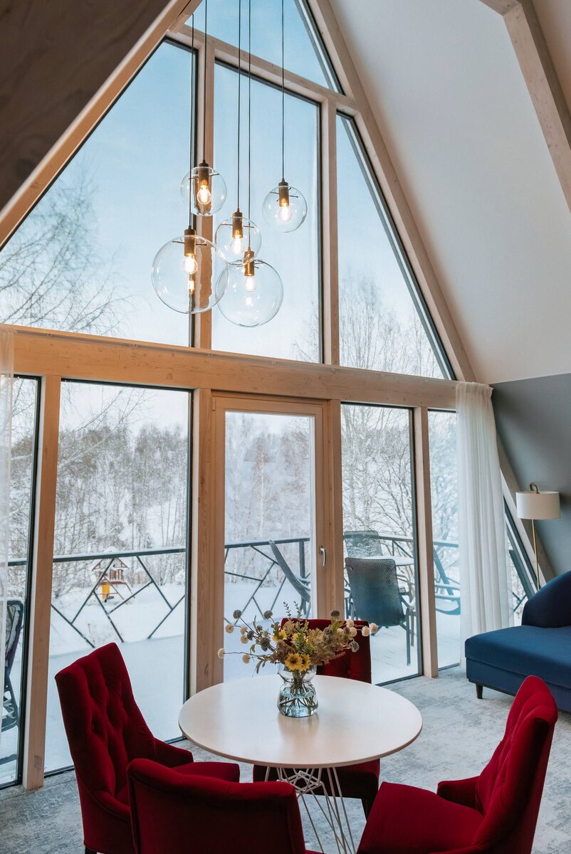 🏠 Дом высшей категории A-frame с террасой и панорамным видом на горы — прекрасный вариант для размещения 4 гостей: семьи с подрастающими детьми (старше 6 лет) или компании друзей Шале Альфа >>