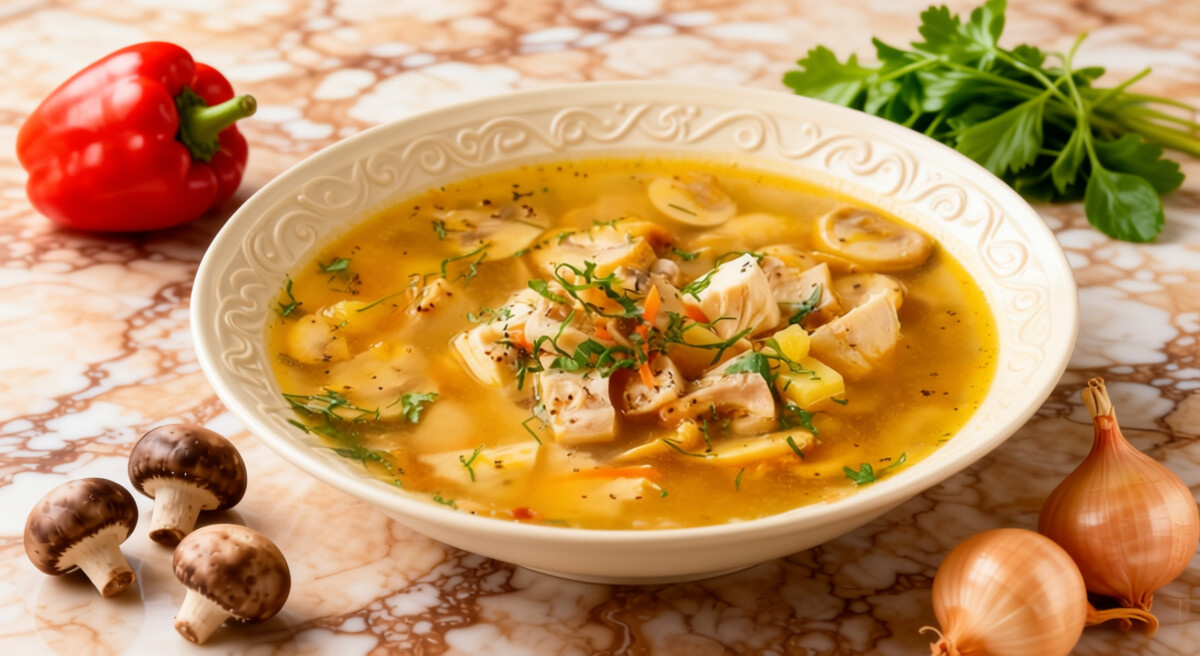 Суп с грибами и курицей – это не только вкусное, но и полезное блюдо. Куриное филе является источником легкоусвояемого белка, необходимого для построения и восстановления тканей организма. Грибы, в свою очередь, богаты витаминами группы В, минералами (такими как калий, фосфор, селен) и антиоксидантами. Они способствуют укреплению иммунитета и улучшению обмена веществ. Картофель обеспечивает организм углеводами, давая энергию, а разнообразие овощей (морковь, болгарский перец, сельдерей) обогащает суп клетчаткой, витаминами А, С и К, а также другими ценными микроэлементами. Регулярное употребление курино‑грибного супа способствует поддержанию здоровья сердечно-сосудистой системы, улучшению пищеварения и общему укреплению организма.