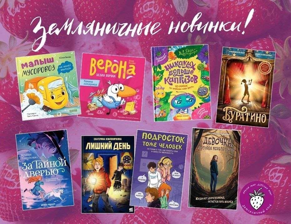 Как ваше настроение? Наверняка радуетесь первым, хоть и не самым тёплым, но весенним дням. А мы радуемся новым книгам, которые вышли у наших земляничных авторов в последний месяц зимы. Малышей порадуют новинки Юлии Весовой . Это «Верона — белая ворона. Мамина помощница», где героиня очень хочет помочь маме с домашними делами, только это оборачивается весёлым хаосом! И продолжение серии о малыше мусоровозе, который на этот раз хорошо потрудился и сильно испачкался. Вот только «Малыш мусоровоз не хочет мыться». Обе новинки вышли в издательстве: «Clever», 0+ Весёлые сказки о приключениях забавных насекомых «Никаких больше капризов» Екатерины Минаевой просто и с юмором расскажут детям о полезных привычках. Издательство «Феникс-Премьер», 3-5 лет Ребятам 6-9 лет будет интересно узнать, что же скрывается «За тайной дверью» Ксении Горбуновой. Как и велит сказочная традиция, все мечты обязательно исполнятся. В этом героям поможет Тайная дверь, которая открывается лишь однажды. Издательство «Фе