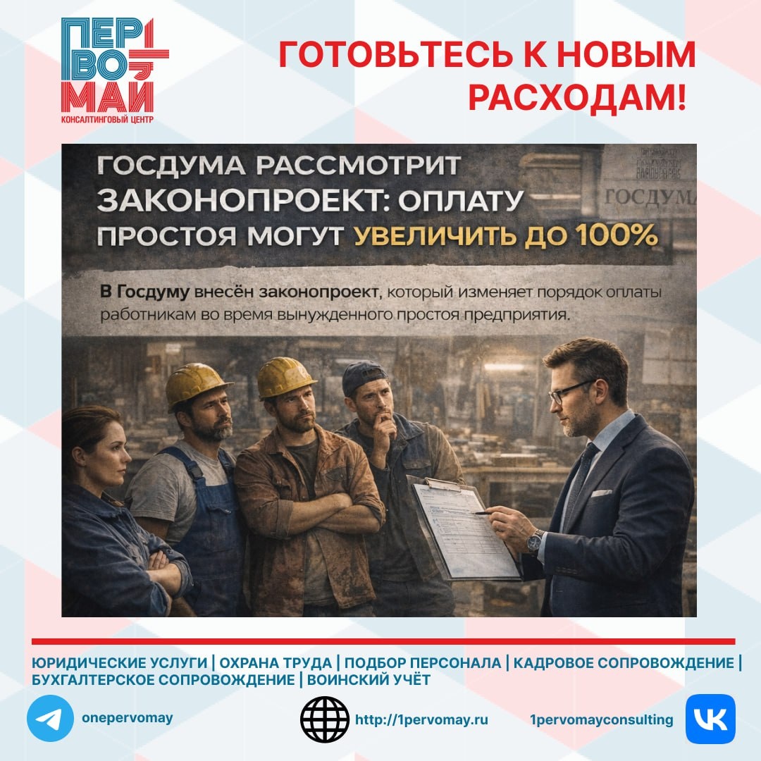 В Госдуму внесён законопроект: обязать работодателей оплачивать простой по их вине в размере 100% средней зарплаты вместо нынешних ⅔. Сейчас простой стоит ⅔ средней зарплаты (статья 72.2 ТК РФ). Если закон примут — 100%. Финансовая нагрузка вырастет на треть. ПРИМЕР 10 работников, средняя зарплата 60 тысяч, простой 2 недели. Сейчас: 10 × 60 000 × ⅔ × 0,5 = 200 тысяч рублей После принятия закона: 10 × 60 000 × 0,5 = 300 тысяч рублей Разница: +100 тысяч за две недели простоя. ❗️ГЛАВНЫЙ РИСК Если простой не по вине работодателя (форс-мажор, авария, действия третьих лиц), оплата остаётся ⅔. Но вину нужно доказать документально. Нет документов — платите 100%. Работники будут требовать полную оплату, а вы не сможете доказать, что простой не по вашей вине. Итог: переплата и иски в суд. Проверьте, правильно ли вы оформляете простои. Есть ли приказы, уведомления работников, документы, подтверждающие причину простоя? Если простой не по вашей вине — можете ли вы это доказать? 📞 +7(343)