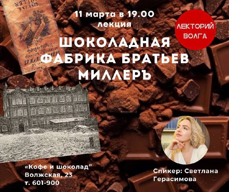 «ШОКОЛАДНАЯ ФАБРИКА БРАТЬЕВ МИЛЛЕРЪ». Саратов, эпоха Российской империи. Приглашаем в незабываемое сладкое путешествие! 🍫 Познакомьтесь с легендарными братьями Миллер — основателями первой и единственной паровой шоколадной фабрики в Саратове, наследниками поволжских немецких колонистов. 🍫 Узнайте, как зародилось их «сладкое» дело и какие изысканные лакомства прославили их имя по всей империи! 🍫 Погрузитесь в волшебный мир кондитерского искусства прошлого. 🍫 Откройте литературные шедевры и фольклорные сказания, оживающие на старинных шоколадных обёртках — каждом кусочке истории, пропитанной ароматом шоколада и величия! 📖 В буквальном смысле прикоснитесь к истории! Лектор представит из своей коллекции уникальные музейные экспонаты – жестяные коробки фабрики Миллер. Спикер: Экскурсовод-лектор Герасимова Светлана. ✴️Ждём вас! Вкусы прошлого — 11 марта в 19:00! 📍Кофе и шоколад на Волжской, 23 Билеты можно купить по ссылке Всё расписание здесь Лекторий "Волга" МАХ ВКонтакте