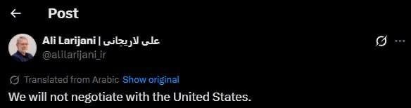 Իրանի ազգային անվտանգության բարձրագույն խորհրդի քարտուղար Ալի Լարիջանին հայտարարել է, որ Թեհրանը բանակցություններ չի վարի ԱՄՆ-ի հետ