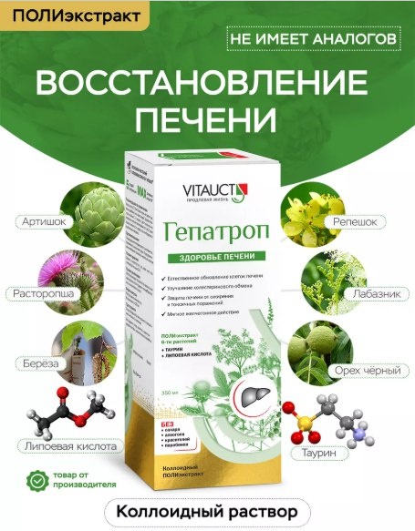 Помогите вашей печени справляться с реальностью, в которой мы живём. Фастфуд, переедание, алкоголь, лекарства, избыток сахара, скрытые токсины — всё это она вынуждена перерабатывать ежедневно😨 Натуральный полиэкстракт "Гепатроп" — уникальный фитокомплекс, не имеющий аналогов по составу и эффективности. Его компоненты способствуют: ✅ Улучшению функционирования печени и желчевыводящих путей ✅ Естественному обновлению клеток печени ✅ Улучшению холестеринового обмена ✅ Защите печени от ожирения и токсичных поражений ✅ Мягкому желчегонному действию ✅ Активации обмена веществ ✅ Нормализации внутриклеточного обмена фосфолипидов 📍 Всё это — в жидкой, коллоидной, легкоусвояемой форме без сахара, спирта, вкусовых добавок, красителей и ароматизаторов. Препарат получил широкое признание, собрал сотни положительных отзывов и стал одной из визитных карточек компании VITAUCT👏 Стоимость: 950 рублей (350 мл) Приобрести «Гепатроп» вы можете в нашем центре по адресу ул.Гагарина, 53 каждый день с 10:00