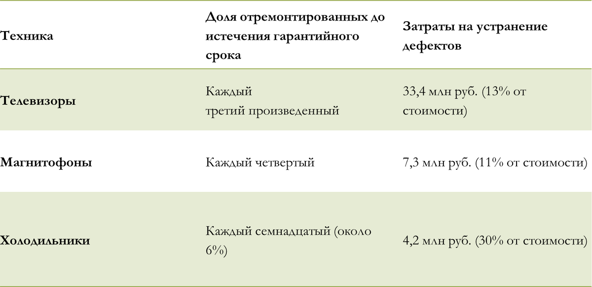 Обратите внимание на цифру по холодильникам: затраты на ремонт составили 30% от стоимости продукции, по которой приняты претензии . То есть если холодильник ломался, его ремонт обходился в треть цены нового.