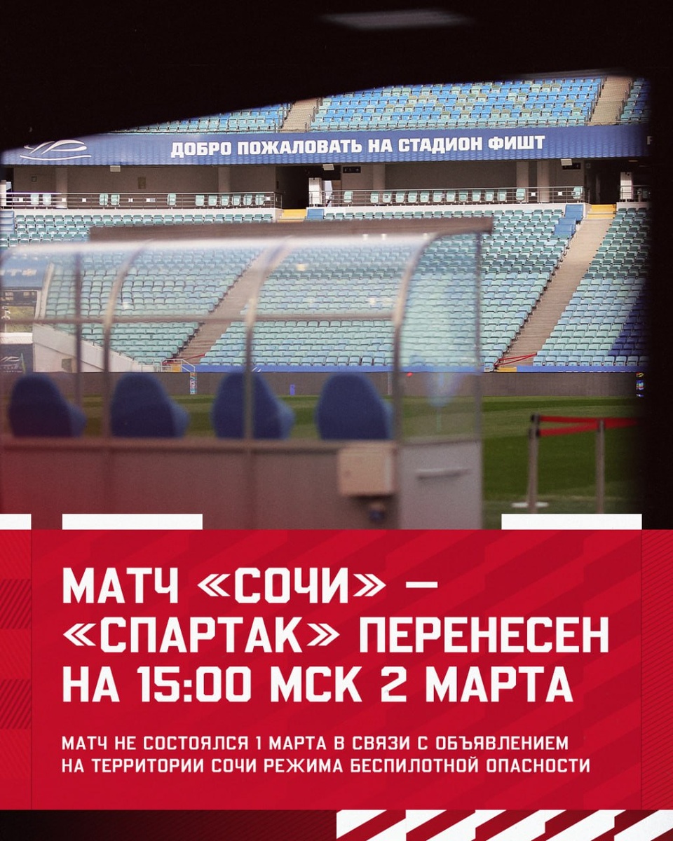 Матч «Спартака» и «Сочи» перенесли на 2 марта. Игра состоится сегодня в 15:00.