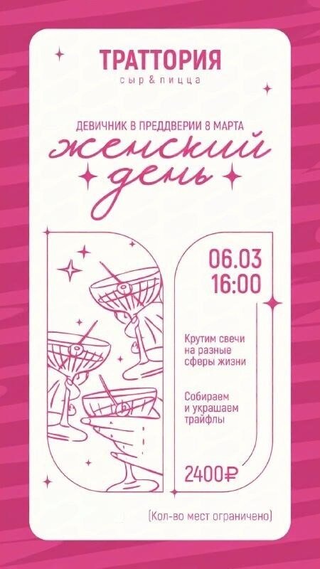 » ✔ Самое по-настоящему женское событие года ✔ Мастер-класс по кручению свечей на разные сферы жизни ✔ Создание и украшение сладких трайфлов в завершение вечера ✔ Атмосферная вечеринка для милых дам в уютном ресторане ✔ Предварительная запись обязательна (до 4 марта, 14:00) 📅 Когда: #6_марта, 16:00 ⛳ Где: ресторан «Траттория Броско», ул. Пионерская, 2В 💳 Стоимость: 2400 руб. 📞 Контакты: +7 (4212) 727-010 👉 Афиша Хабаровска. Куда сходить, экскурсии