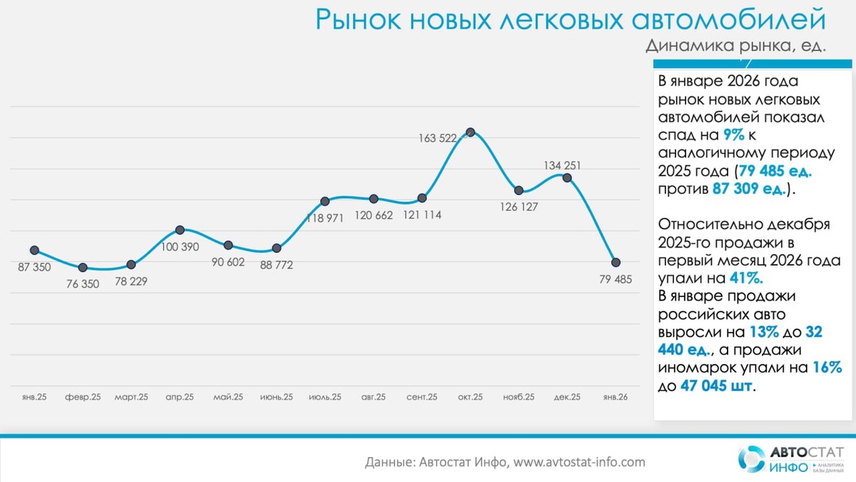 По данным «Автостат Инфо», январь 2026 года на российском рынке новых легковых автомобилей оказался не столько «провалом», сколько жестким возвращением к более трезвому уровню спроса после перегретого финала 2025-го. За первый месяц этого года было реализовано 79 485 новых легковых машин против 87 309 годом ранее, то есть рынок снизился на 9% в годовом выражении. Но еще важнее другое сравнение: относительно декабря 2025 года, когда продажи достигали 134 251 единицы, январский результат оказался сразу на 41% ниже. Это показывает не просто сезонную коррекцию, а довольно резкое охлаждение. Если смотреть на месячную траекторию, январь 2026 года выглядит как возврат к диапазону, в котором рынок жил в начале 2025-го. Тогда в феврале было продано 76 350 машин, в марте — 78 229 авто, в мае — 90 602 шт., в июне — 88 772 шт. На этом фоне нынешние 79 485 единиц ближе не к декабрьским и осенним максимумам, а к весенней базе прошлого года. И это принципиально: рынок не обрушился до экстремально ни