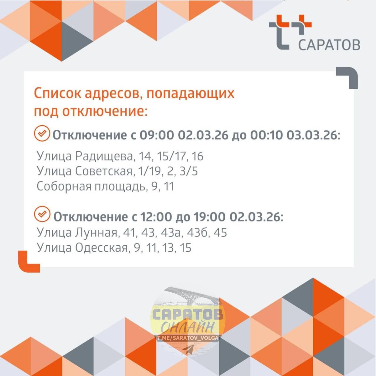 Сегодня "Т Плюс" будет ремонтировать трубопроводы на улицах Радищева и Одесской. В связи с этим ограничат подачу отопления и горячей воды жителям Волжского, Октябрьского и Ленинского районов Саратова. Адреса и время отключений - в карточке 👆 ▫️САРАТОВ ОНЛАЙН ▪️ЭНГЕЛЬС ОНЛАЙН 📲 Мы в мессенджере MAX