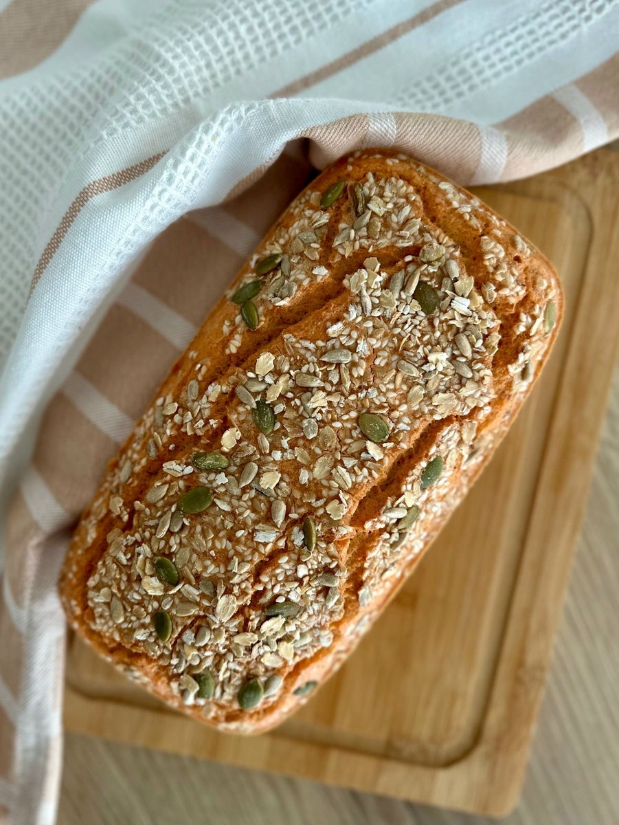 4. При желании украсить смесью кунжута, овсяных хлопьев, подсолнечных и тыквенных семян.