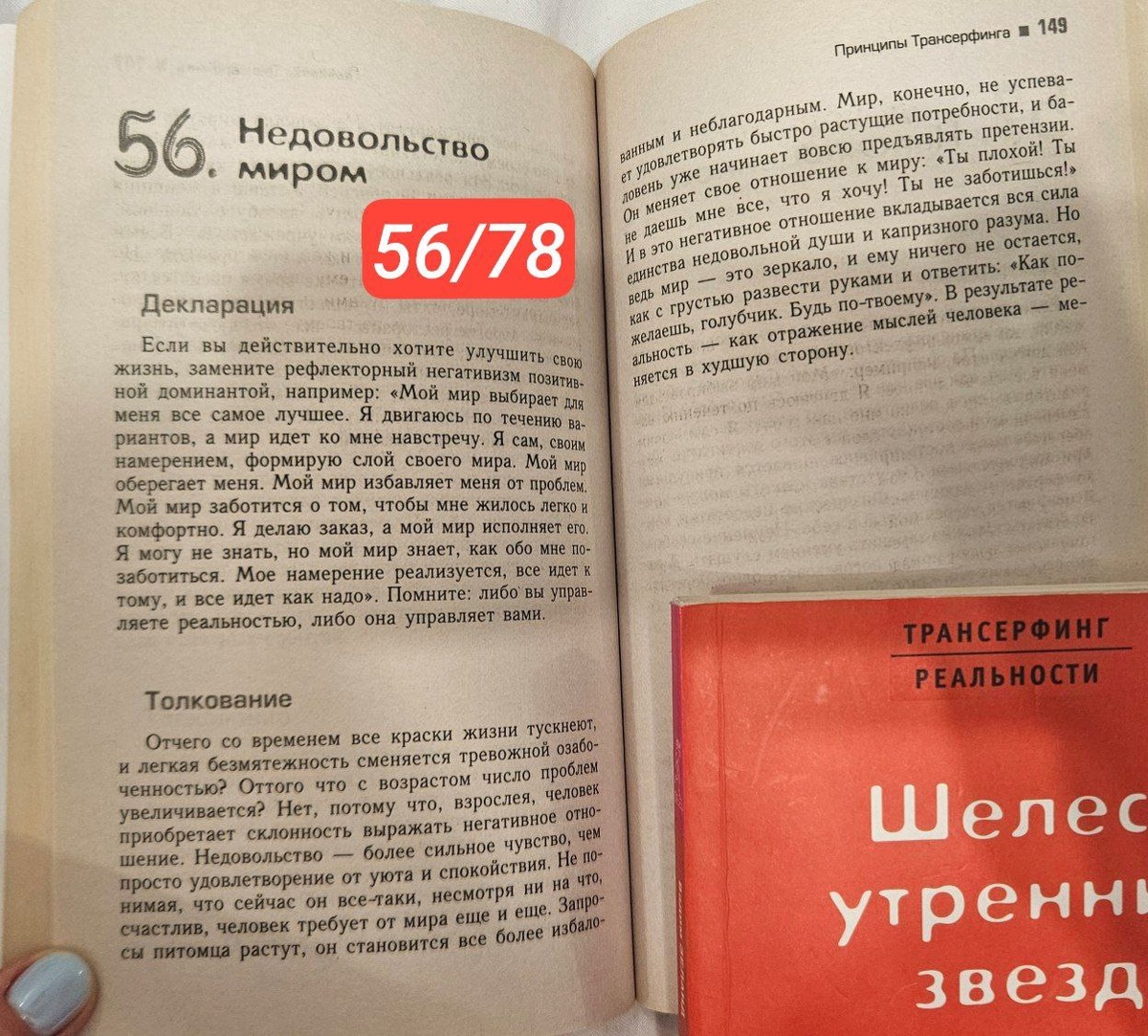 56/78 Практикум управления реальностью - Трансерфинг Недовольство миром "Мой мир выбирает для меня все самое лучшее. Я двигаюсь по течению вариантов, а мир идет ко мне на встречу. Я сам, своим намерением, формирую слой своего мира. Мой мир оберегает меня. Мой мир избавляет меня от проблем. Мой мир заботится о том, чтобы мне жилось легко и комфортно. Я делаю заказ, а мой мир исполняет его. Я могу не знать, но мой мир знает, как обо мне позаботиться. Мое намерение реализуется, все идет к тому, и все идет, как надо." "Помните, либо вы управляете реальностью, либо она управляет вами." "Отчего со временем краски жизни тускнеют и легкая безмятежность сменяется тревожной озабоченностью? Взрослея, человек приобретает склонность выражать негативное отношение. Недовольство - более сильное чувство, чем просто удовлетворение от уюта и спокойствия. Не понимая, что сейчас он все-таки не смотря ни на что счастлив, человек требует от мира еще и еще. "Ты плохой, ты не даешь мне все, что я хочу, ты
