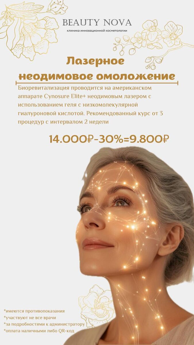 !🌟 Девушки, март — лучшее время для обновления кожи❤️ Мы подготовили специальные предложения на самые востребованные лазерные методики, чтобы сделать вашу кожу идеальной.⬇️ 🤍Лазерное неодимовое омоложение Laser Facial 🟣14.000₽-30%=9.800₽ Лазерное омоложение и устранение сосудов Elite+ - это прекрасный выбор для тех, кому необходимо выглядеть хорошо "здесь и сейчас", у кого нет времени на длительную реабилитацию, а также для поддержания состояния кожи после 25 лет. Биоревитализация проводится на американском аппарате Cynosure Elite+ неодимовым лазером с использованием геля с низкомолекулярной гиалуроновой кислотой. Лазерное излучение за счет определенных параметров открывает транспортные каналы в коже - без нарушения ее структуры и повреждения поверхности. По этим каналам гиалуроновая кислота проникает в глубокие слои кожи и увлажняет ее. Кроме того, запускаются синтетические и регенеративные процессы в коже, что дает улучшение ее цвета и текстуры. Процедура безболезненная, безопа